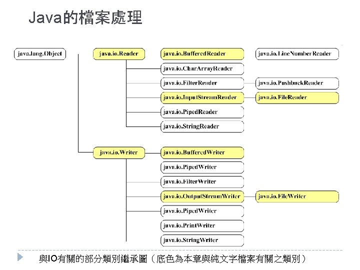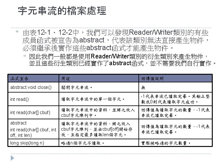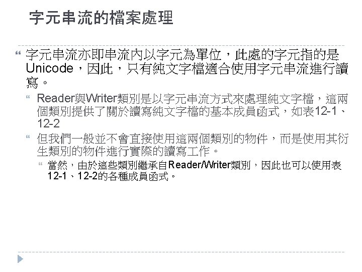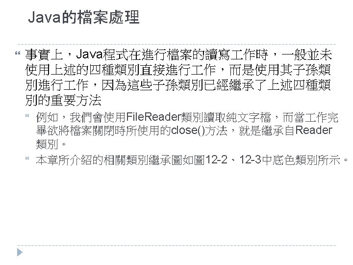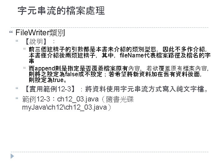 字元串流的檔案處理 File. Writer類別 相對於File. Reader的讀取功能,File. Writer類別則提供寫入文 字檔的功能。同樣地,Output. Stream. Writer為Writer的子類別, File. Writer為Output. Stream. Writer的子類別(見圖 12 -2),因 此,File. Writer產生的物件也可以使用祖先類別的方法。 寫入的開檔動作同樣包含在建構子,File. Writer的建構子如下: File. Writer的建構子 File. Writer(File file) File. Writer(File file, boolean append) File. Writer(File. Descriptor fd) File. Writer(String file. Name, boolean append) //上述建構子會拋出IOException例外