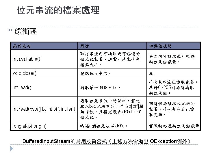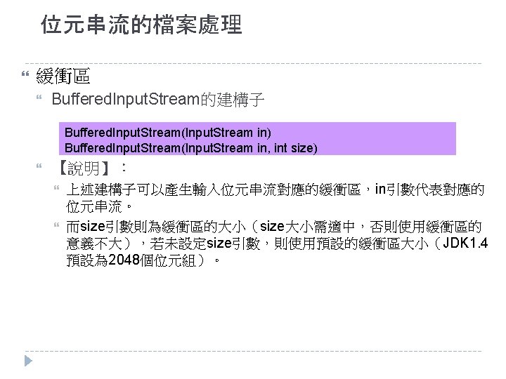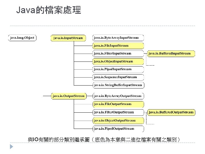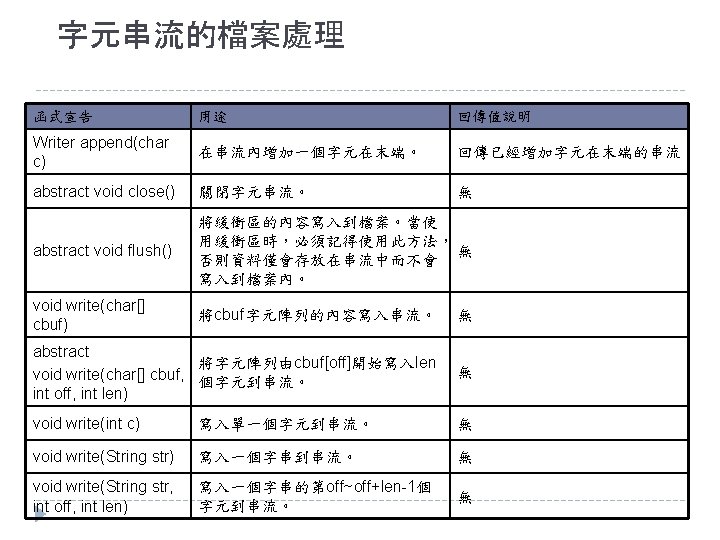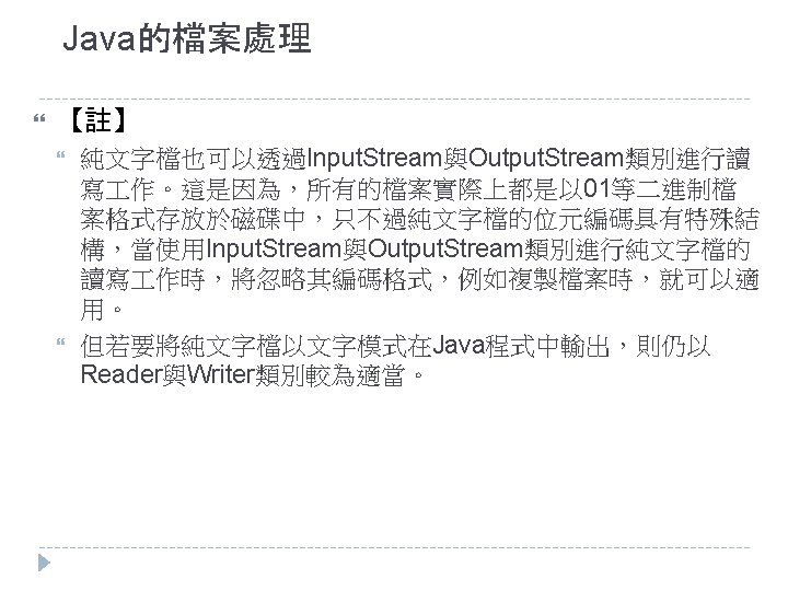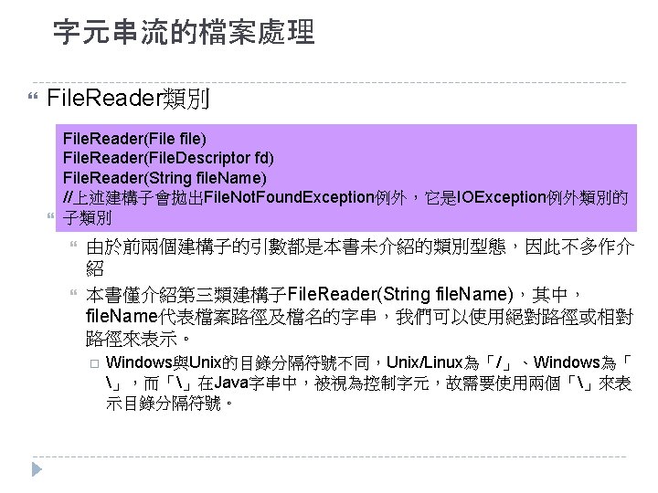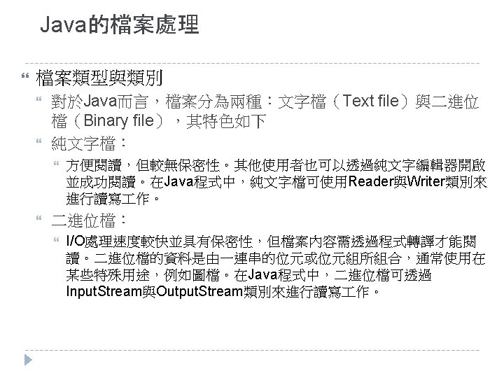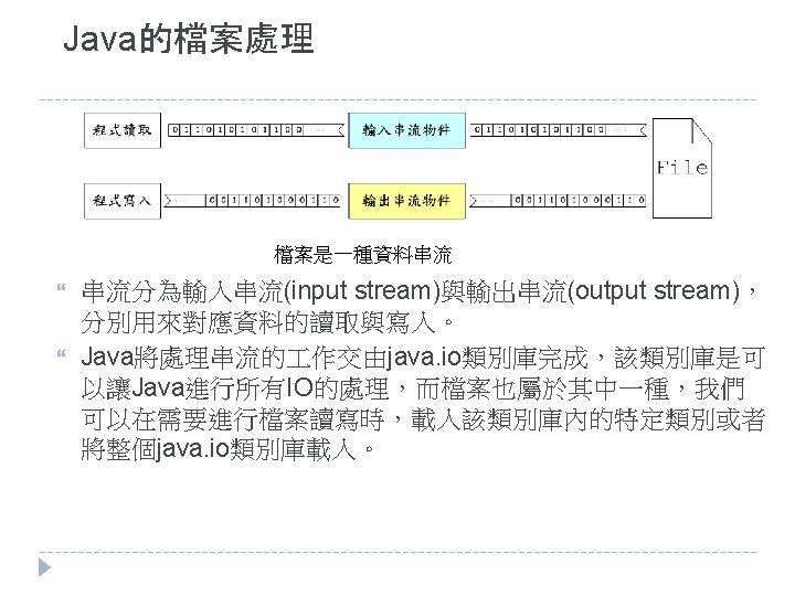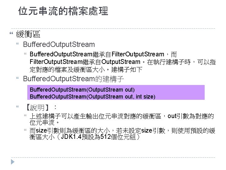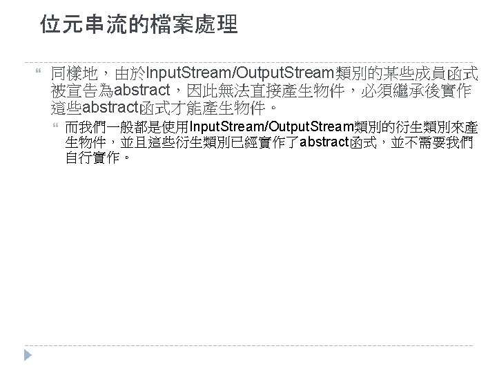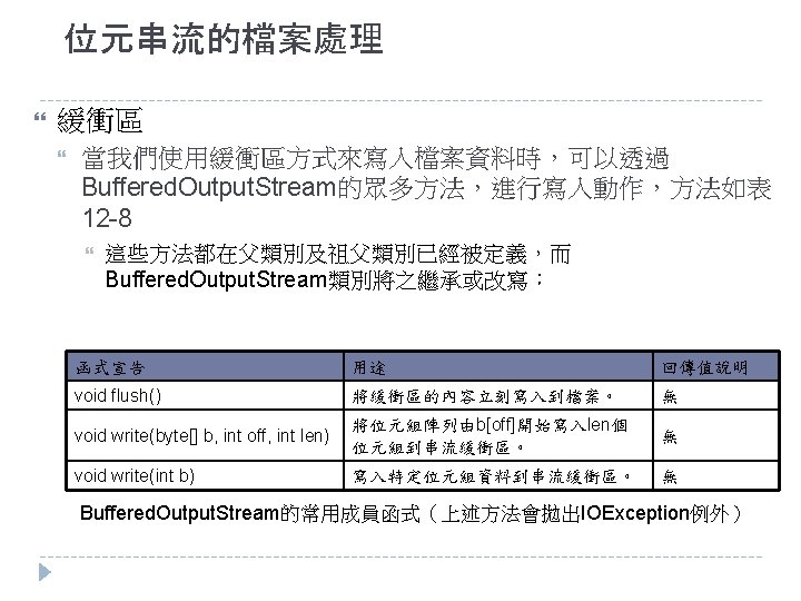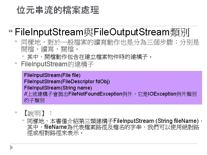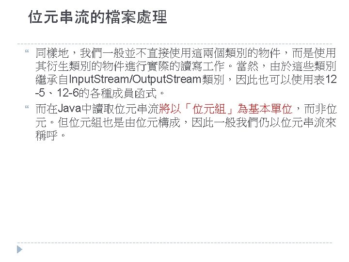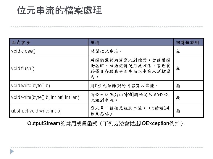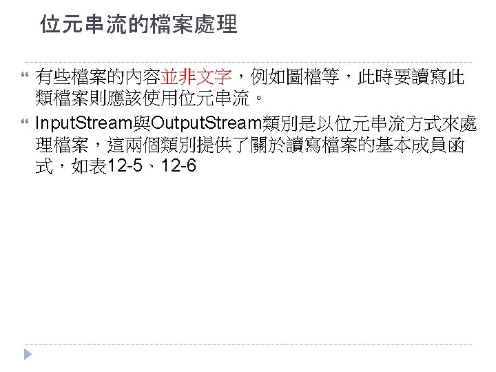 位元串流的檔案處理 File. Input. Stream與File. Output. Stream類別 File. Output. Stream的建構子 File. Output. Stream(File file) File. Output. Stream(File file, boolean append) File. Output. Stream(File. Descriptor fd. Obj) File. Output. Stream(String name, boolean append) //上述建構子會拋出IOException例外 【說明】: 同樣地,本書僅介紹後兩類建構子,其中,file. Name為代表檔案路徑 及檔名的字串,而append則是指定是否覆蓋檔案原有內容,若欲覆 蓋原有檔案內容,則將之設定為false或不設定;若希望將新資料加 在舊有資料後面,則設定為true。