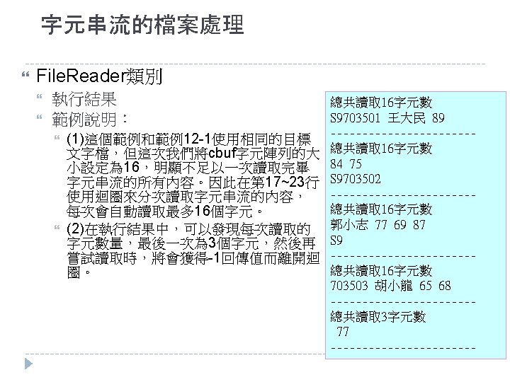 字元串流的檔案處理 File. Reader類別 15 16 17 18 19 20 21 22 23 24 25 26 int num; String str 1; while((num = fr. read(cbuf)) !=-1) //使用迴圈讀取文字檔的全部內容 { str 1 = new String(cbuf, 0, num); //字元陣列轉換為字串 System. out. println("總共讀取" + num + "字元數"); System. out. println(str 1); System. out. println("------------"); } fr. close(); //關檔 } }