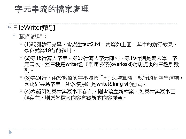 字元串流的檔案處理 File. Writer類別 1 2 3 4 5 6 7 8 9 10 11 12 13 14 15 16 17 18 19 20 21 22 /* 檔名: ch 12_03. java 功能: 以字元串流寫入文字檔 */ package my. Java. ch 12; import java. lang. *; import java. io. *; public class ch 12_03 //主類別 { public static void main(String args[]) throws IOException { String str 1 = "費氏數列如下: "; char end. Ch[] = {'C', 'o', 'n', 't', 'i', 'n', 'u', 'e', '. '}; int num. F; File. Writer fw = new File. Writer("c: \my. Java\ch 12\file\text 2. txt"); fw. write(str 1); fw. write('r'); fw. write('n'); for(int i=1; i<10; i++) { //寫入換行字元