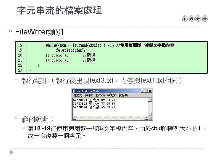 字元串流的檔案處理 File. Writer類別 1 2 3 4 5 6 7 8 9 10 11 12 13 14 15 16 17 【實用範例12 -5】:複製文字檔。 範例12 -5:ch 12_05. java(隨書光碟 my. Javach 12_05. java) /* 檔名: ch 12_05. java 功能: 複製文字檔 */ package my. Java. ch 12; import java. lang. *; import java. io. *; public class ch 12_05 //主類別 { public static void main(String args[]) throws IOException, File. Not. Found. Exception { char cbuf[] = new char[1]; File. Reader fr = new File. Reader("c: \my. Java\ch 12\file\text 1. txt"); File. Writer fw = new File. Writer("c: \my. Java\ch 12\file\text 3. txt"); int num; String str 1;