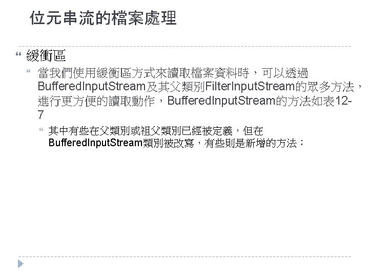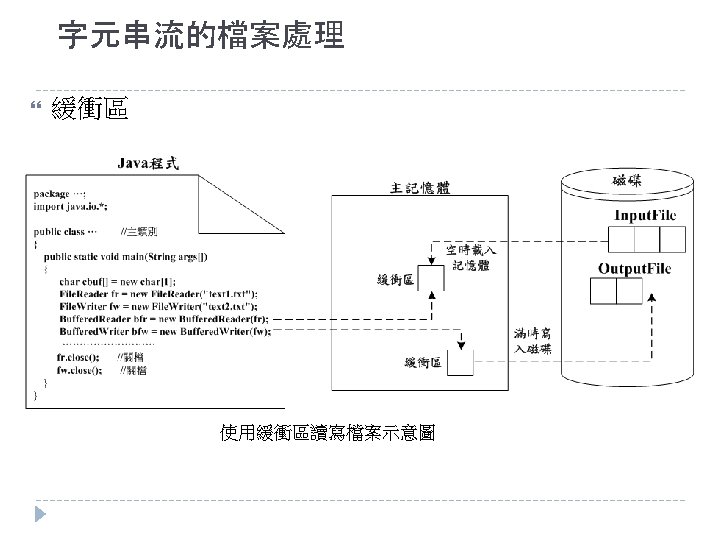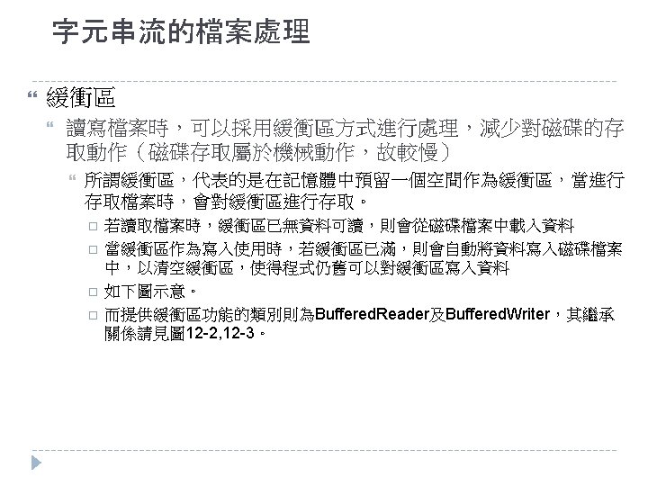 位元串流的檔案處理 緩衝區 1 2 3 4 5 6 7 8 9 10 11 12 13 14 15 【實用範例12 -9】:使用位元串流搭配緩衝區讀取文字檔內容, 並寫入另一個檔案中。 範例12 -9:ch 12_09. java(隨書光碟 my. Javach 12_09. java) /* 檔名: ch 12_09. java 功能: 複製並輸出檔案 */ package my. Java. ch 12; import java. lang. *; import java. io. *; public class ch 12_09 //主類別 { public static void main(String args[]) throws IOException, File. Not. Found. Exception { File. Input. Stream fi = new File. Input. Stream("c: \my. Java\ch 12\file\text 1. txt"); File. Output. Stream fo = new File. Output. Stream("c: \my. Java\ch 12\file\text 5. txt"); Buffered. Input. Stream buf. In = new Buffered. Input. Stream(fi);