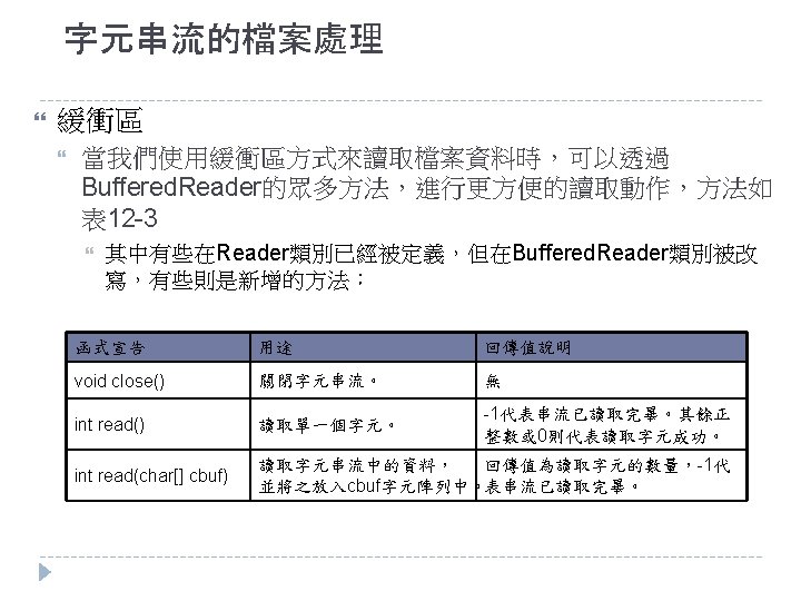 字元串流的檔案處理 緩衝區 1 2 3 4 5 6 7 8 9 10 11 12 13 14 15 16 17 18 19 20 21 22 23 /* 檔名: ch 12_06. java 功能: 使用緩衝區讀取文字檔 */ package my. Java. ch 12; import java. lang. *; import java. io. *; public class ch 12_06 //主類別 { public static void main(String args[]) throws IOException, File. Not. Found. Exception { String str 1; File. Reader fr = new File. Reader("c: \my. Java\ch 12\file\text 1. txt"); Buffered. Reader buffer. In = new Buffered. Reader(fr); while((str 1=buffer. In. read. Line())!=null) { System. out. println(str 1); } fr. close(); //關檔 } }