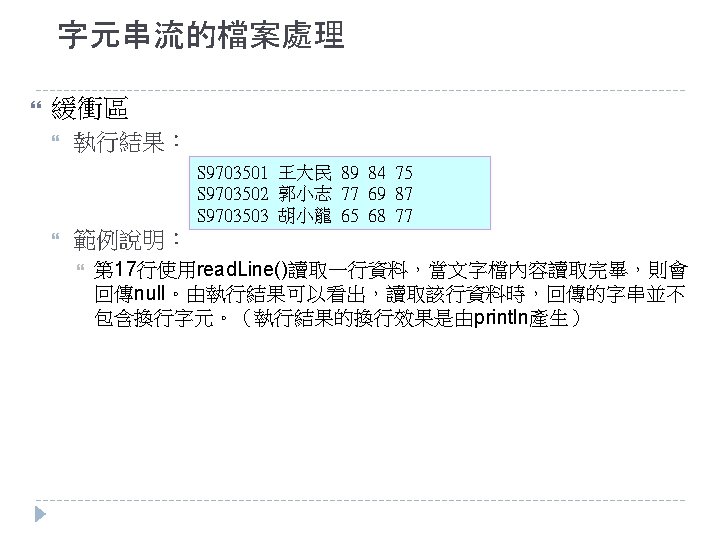 位元串流的檔案處理 緩衝區 16 17 18 19 20 21 22 23 24 25 26 27 28 } Buffered. Output. Stream buf. Out = new Buffered. Output. Stream(fo); int file. Size=fi. available(); byte. Data[] = new byte[file. Size]; buf. In. read(byte. Data, 0, file. Size); buf. Out. write(byte. Data, 0, file. Size); String str 1 = new String(byte. Data); //轉換位元組陣列為字串 buf. Out. flush(); //記得要flush, 否則串流內資料不會寫入檔案中 System. out. println("檔案複製完畢, 內容如下"); System. out. println(str 1); fi. close(); //關檔 fo. close(); //關檔 執行結果: } 檔案複製完畢, 內容如下 S 9703501 王大民 89 84 75 S 9703502 郭小志 77 69 87 S 9703503 胡小龍 65 68 77