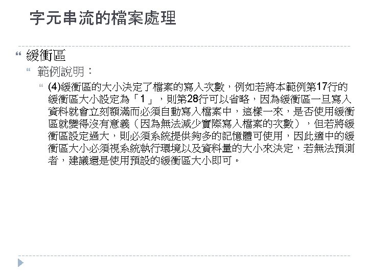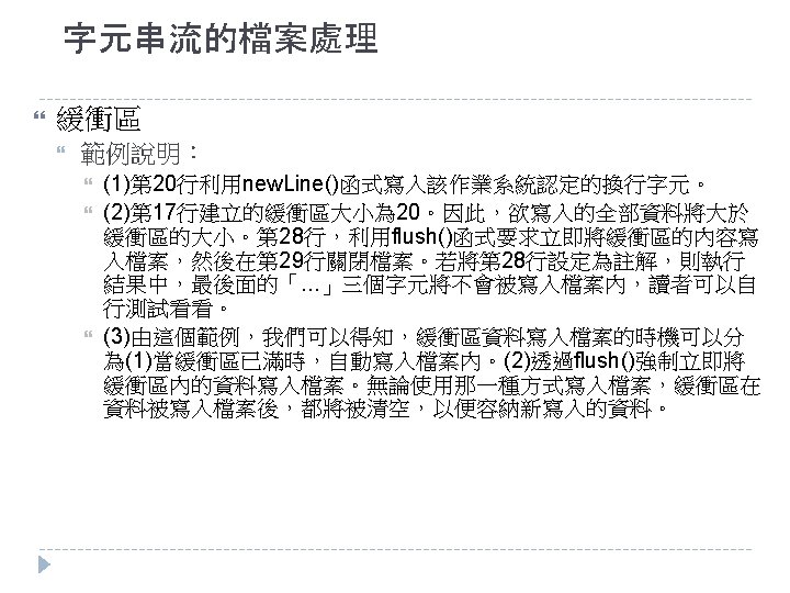 字元串流的檔案處理 緩衝區 8 9 10 11 12 13 14 15 16 17 18 19 20 21 22 23 24 25 26 27 28 29 30 public class ch 12_07 //主類別 { public static void main(String args[]) throws IOException { String str 1 = "費氏數列如下: "; char end. Ch[] = {'C', 'o', 'n', 't', 'i', 'n', 'u', 'e', '. '}; int num. F; File. Writer fw = new File. Writer("c: \my. Java\ch 12\file\text 4. txt"); Buffered. Writer buffer. Out = new Buffered. Writer(fw, 20); buffer. Out. write(str 1); buffer. Out. new. Line(); for(int i=1; i<10; i++) { num. F=Fib(i); buffer. Out. write(num. F+" } buffer. Out. new. Line(); buffer. Out. write(end. Ch); buffer. Out. flush(); fw. close(); //關檔 } //寫入換行字元 "); //int與字串連結, 會自動轉型為字串 //寫入換行字元 //重要, 請看註解
