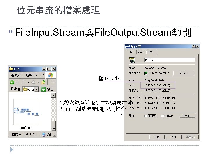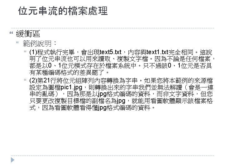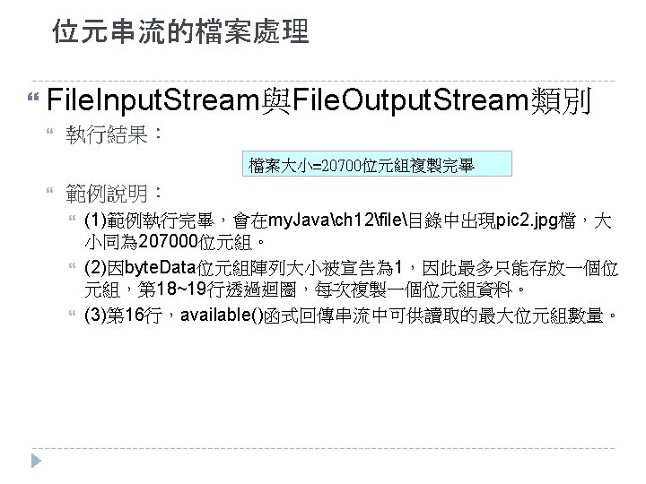 位元串流的檔案處理 File. Input. Stream與File. Output. Stream類別 17 18 19 20 21 22 23 24 int num; while((num = fi. read(byte. Data)) !=-1) //使用迴圈逐一複製每一個位元組 fo. write(byte. Data); System. out. println("檔案大小=" + file. Size + "位元組複製完畢"); fi. close(); //關檔 fo. close(); //關檔 } } pic 1. jpg(隨書光碟 my. Javach 12filepic 1. jpg)