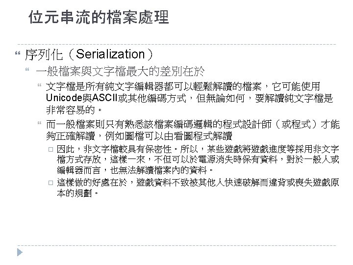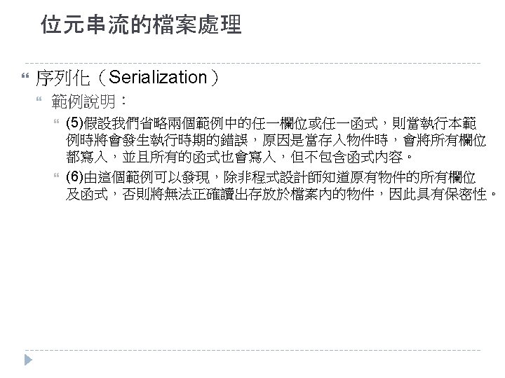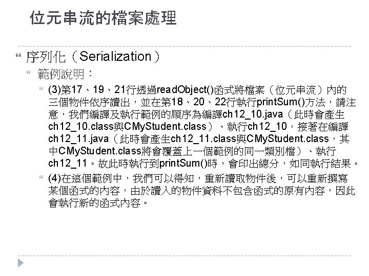 位元串流的檔案處理 序列化(Serialization) 17 18 19 20 21 22 23 24 25 26 27 28 29 30 31 32 33 34 35 36 37 38 39 obj 1=(CMy. Student)ois. read. Object(); obj 1. print. Sum(); ois. close(); fi. close(); //關檔 } } class CMy. Student implements Serializable //CMy. Student實作Serializable介面 { private String id; private String name; private int score. Computer; private int score. Math; private int score. English; private int score. Sum; public CMy. Student(String str 1, String str 2, int i, int j, int k) {