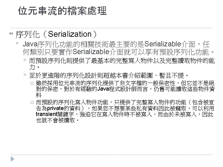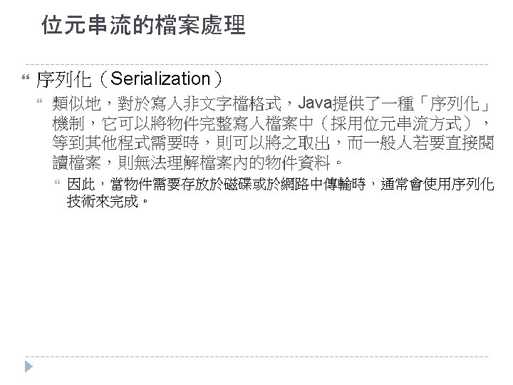 位元串流的檔案處理 序列化(Serialization) Object. Output. Stream類別與write. Object()方法 由圖 12 -3中,我們可以發現Object. Output. Stream類別繼承自 Output. Stream類別,其建構子及write. Object()方法分別如下: Object. Output. Stream(Output. Stream out) // Object. Output. Stream建構子 void write. Object(Obecjt obj) //寫入物件到位元串流 Object. Input. Stream類別與read. Object()方法 由圖 12 -3中,我們可以發現Object. Input. Stream類別繼承自 Input. Stream類別,其建構子及read. Object()方法分別如下: Object. Input. Stream(Input. Stream in) // Object. Input. Stream建 構子 Object read. Object() //由位元串流讀出物件並回傳