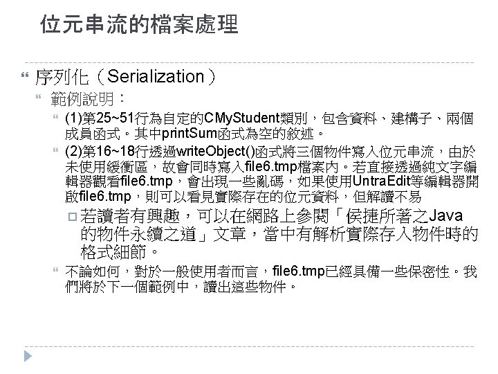 位元串流的檔案處理 12 13 14 15 16 17 18 19 20 21 22 23 24 25 26 27 28 29 30 31 32 33 34 序列化(Serialization) { File. Output. Stream fo = new File. Output. Stream("c: \my. Java\ch 12\file 6. tmp"); Object. Output. Stream oos = new Object. Output. Stream(fo); oos. write. Object(new CMy. Student("S 9703501", "王大民", 89, 84, 75)); oos. write. Object(new CMy. Student("S 9703502", "郭小志", 77, 69, 87)); oos. write. Object(new CMy. Student("S 9703503", "胡小龍", 65, 68, 77)); oos. close(); fo. close(); //關檔 } } class CMy. Student implements Serializable //CMy. Student實作Serializable介面 { private String id; private String name; private int score. Computer; private int score. Math; private int score. English; private int score. Sum; public CMy. Student(String str 1, String str 2, int i, int j, int k)