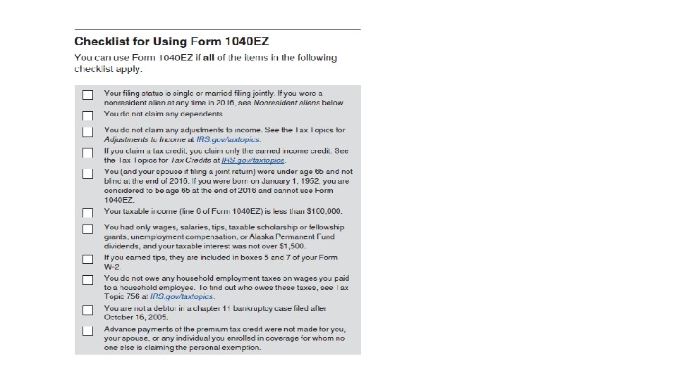 Tax Forms • 1040 EZ • File form 1040 EZ BY APRIL 18 TH, 2017 • Do Not File Form 1040 EZ if You Are Claiming the Premium Tax Credit or You Are Required To Reconcile Advance Payments of the Premium Tax Credit • If you are claiming the premium tax credit, file Form 8962 with Form 1040, 1040 A, or 1040 NR. DO NOT use Form 1040 EZ. • If you must reconcile advance payments of the premium tax credit, file Form 8962 with Form 1040, 1040 A, or 1040 NR. DO NOT use Form 1040 EZ. See Requirement To Reconcile Advance Payments of the Premium Tax Credit below.