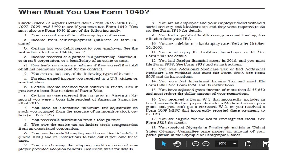 1040 A – Who Can Use Form 1040 A • You can use Form 1040 A if all six of the following apply. • You only had income from wages, salaries, tips, interest and ordinary dividends, and capital gain distributions, taxable scholarship and fellowship grants, pensions, annuities, and IRAs, unemployment compensation, taxable soc security and railroad retirement benefits • The only adjustments to income you can claim are: • • Educator expenses, IRA deduction, student loan interest deduction, and tuition and fees deduction. You don’t itemize deductions. Your taxable income(line 27) is less than $100, 000 The only tax credits you can claim are for credit for child and dependent care expenses, credit for elderly or the disabled, education credits, retirement savings contributions credit, child tax credit, earned income credit, additional child tax credit, and premium tax credit. You didn’t have an alternative minimum tax adjustment on stock you acquired from the exercise of an incentive stock option.