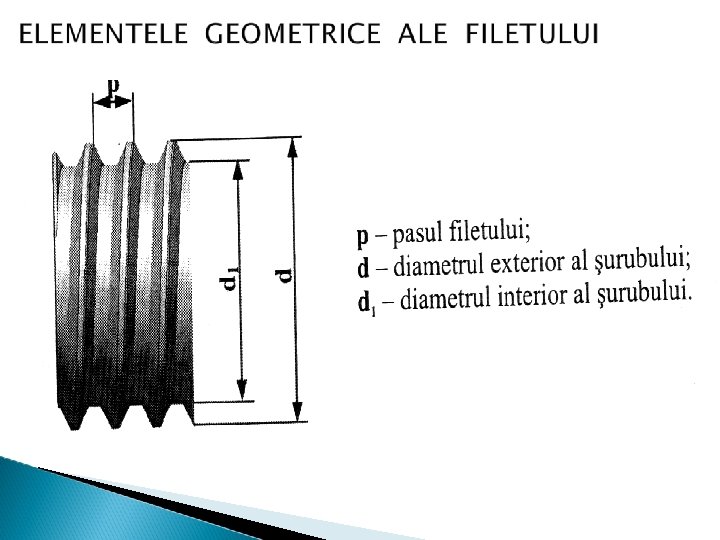 Pasul filetului , notat cu p , este distanța măsurată pe o paralelă la axa filetului , între două puncte consecutive ale aceleiași spire Diametrul exterior , notat cu d la șuruburi și D la piulițe , reprezintă distanța dintre vârfurile filetului la șuruburi , respectiv fundurile filetului la piulițe , măsurată perpendicular pe axa filetului Diametrul interior , notat cu d 1 la șuruburi și D 1 la piulițe , reprezintă distanța dintre fundurile filetului la șuruburi , respectiv vârfurile filetului la piulițe