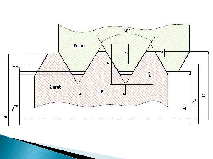 Diametrul mediu , notat cu d 2 la șuruburi și D 2 la piulițe , reprezintă distanța dintre mijloacele flancurilor filetului măsurat perpendicular pe axa filetului Unghiul filetului , notat cu α, este cuprins între flancurile consecutive ale filetului