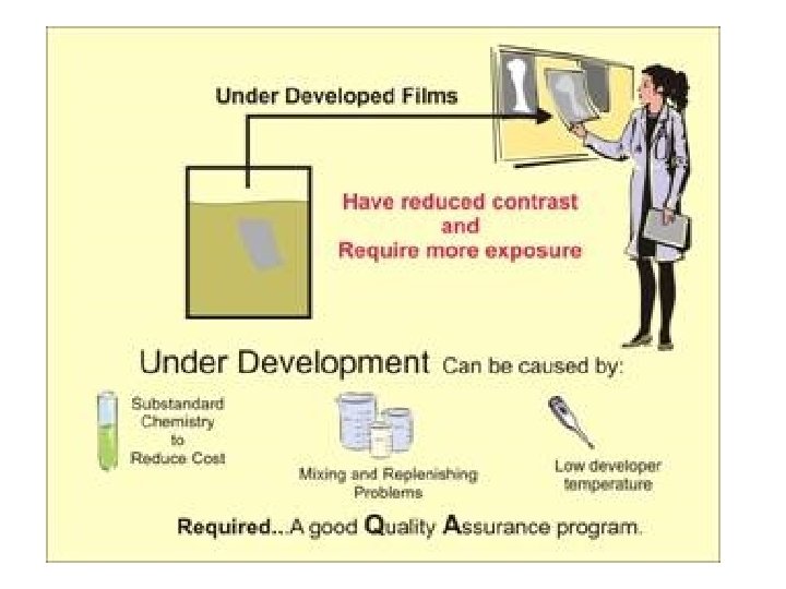 Sensitometric curve • • Developer temp Can effect Slope of curve Less exposure is needed for higher • Dev temps DENSITY • What is the ave temp? for a 90 sec processor? 100º 90º Log of relative exposure