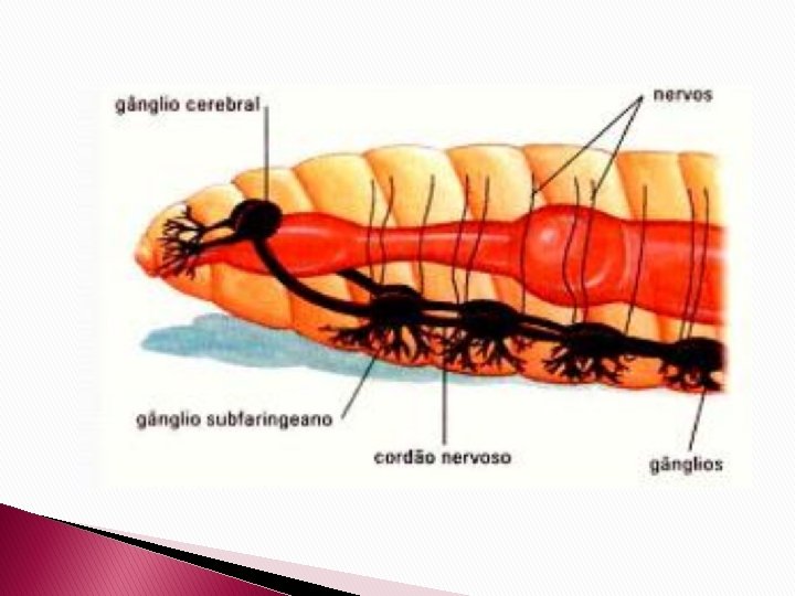 Sistema Nervoso � O sistema nervoso é centralizado, do tipo ganglionado. Há um par de gânglios cerebróides localizados sobre a faringe, de cada um dos quais parte um cordão nervoso longitudinal e ventral. � Em cada anel há um par de gânglios dos quais partem nervos que se dirigem para os órgãos e para a superfície do corpo.