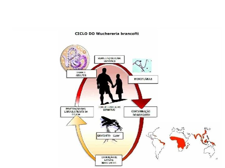 Filo Nematelmintos Verminoses causadas por Nematelmintos • Filariose (elefantíase) - Agente etiológico: Wuchereria bancrofti; - Hospedeiros: humanos (definitivos) e mosquitos (intermediários – Culex, Anopheles, Aedes); - Local do parasitismo: vasos linfáticos, obstruindo-os. A linfa produzida naturalmente pelo organismo não é reabsorvida, resultando em inchaços (principalmente dos membros).