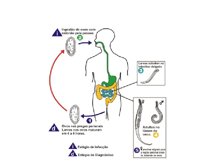 Filo Nematelmintos Verminoses causadas por Nematelmintos • Oxiuríase - Agente etiológico: Enterobius vermiculares; - Hospedeiros: apenas humanos; - Local do parasitismo: intestino grosso. As fêmeas botam ovos na região perianal, causando muito prurido. Irritabilidade, diarreia, náuseas, emagrecimento, vômitos e dores abdominais são os outros sintomas.