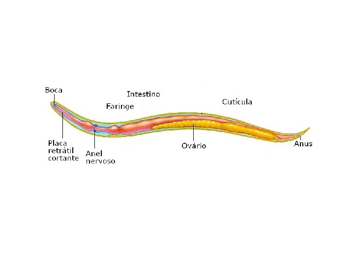 Filo Nematelmintos Características: • Padrão corporal: vermes de corpo cilíndrico e alongado, não-segmentado (liso) e revestido por cutícula proteica; • Protostômios, triblásticos e apresentam simetria bilateral; • Novidades Evolutivas: - Tubo digestório completo (com duas aberturas, boca e ânus): Qual é a vantagem?