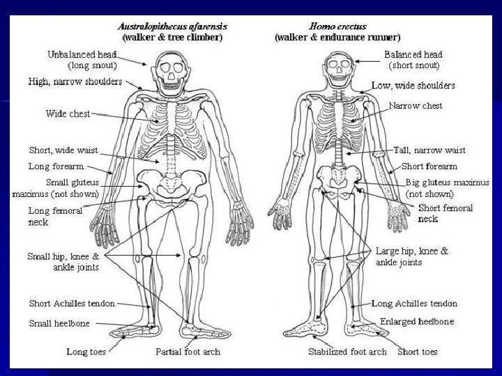 ♦ Australopithecus afarensis ü Até ao presente, foram já encontrados fragmentos desta espécie pertencentes a mais de 300 indivíduos, datados entre 4 e 2, 7 M. A. . ü Hominídeo bípede de baixa estatura (1. 2 a 1. 5 de altura). ü Mãos e dentes similares aos dos humanos modernos. ü Foi desenterrado em Laetolil (Tanzânia) em 1975. ü Fonte evolutiva das estirpes australopitecina e humana. ü Já possuía um posicionamento perfeitamente bípede.