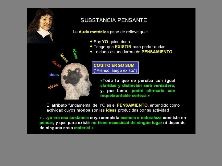 La primera verdad de la filosofía de Descartes: la existencia de un yo pensante, cogito o res cogitans • La duda metódica no desemboca en el escepticismo • Si dudo, aunque me engañe, aunque mis pensamientos sean erróneos, hay algo de lo que no puedo dudar y es que estoy dudando, que estoy pensando. Y si pienso, existo • Descartes lo expresa con la célebre frase: Cogito, ergo sum (Pienso luego existo)