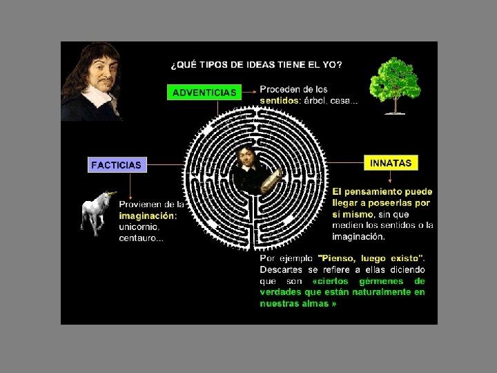 Las ideas • El contenido del pensamiento para Descartes son las ideas • A diferencia de Platón las ideas son subjetivas, imágenes de las cosas • Distingue tres tipos: Ideas adventicias (venidas de fuera) Son las que proceden de la experiencia Ideas facticias (inventadas por mí mismo) Son las que proceden de la imaginación humana Ideas innatas (nacidas conmigo) Son las construidas por la razón