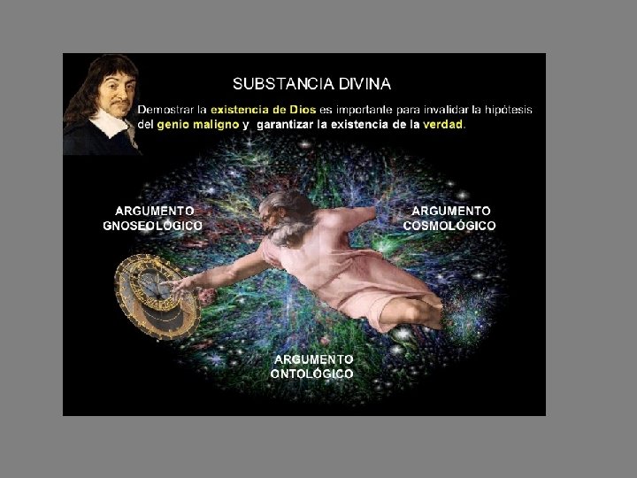 El segundo principio de la filosofía cartesiana: la existencia de Dios o res infinita • Para el racionalismo las ideas innatas son las más importantes • La idea de triángulo, la idea de pensamiento o la idea de infinitud son ideas innatas • Descartes identifica la idea de infinitud con Dios. • Va a demostrar su existencia mediante tres argumentos: el argumento gnoseológico, el argumento cosmológico y el argumento ontológico
