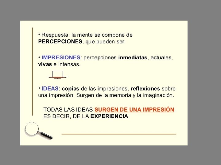 La teoría del conocimiento de Hume • Hume sustituye el término idea de Locke y Descartes, que le parece impreciso por el de percepciones • Para Hume conocer es percibir • Hay dos clases de percepciones: Impresiones que son las percepciones sensibles de nuestra experiencia externa como interna Ideas que son las imágenes debilitadas de las impresiones