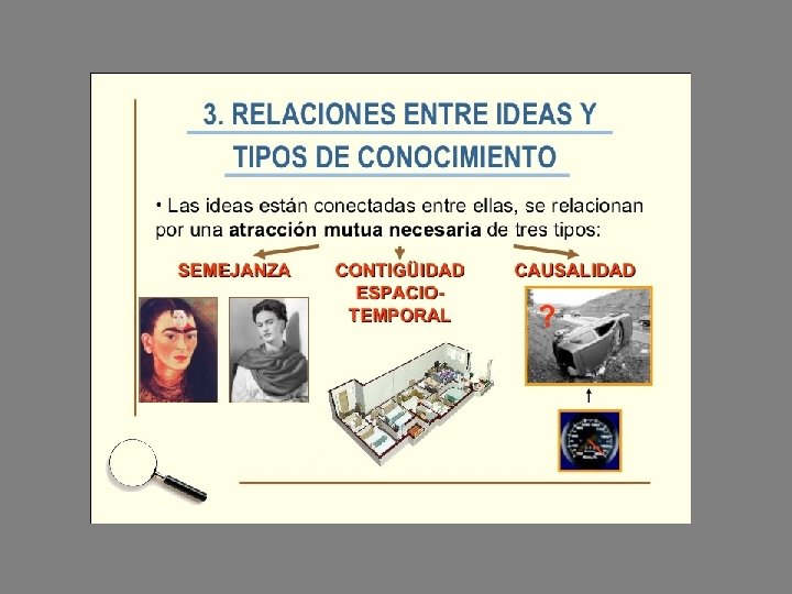 La teoría del conocimiento de Hume • La mente puede ir más allá de las impresiones y formar ideas gracias a La memoria y a la Imaginación La imaginación es la facultad que asocia unas ideas con otras mediante tres leyes: La ley de la semejanza La ley de la contigüidad espaciotemporal La ley de la causalidad Son las leyes de ideas de asociación