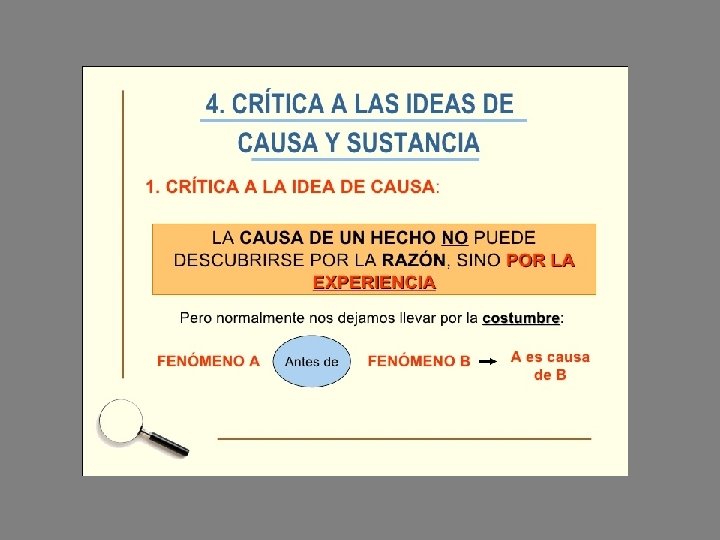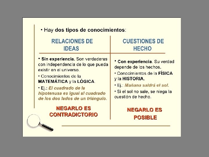 La teoría del conocimiento de Hume • Hume distingue dos tipos de conocimiento: Relaciones de ideas que son verdades formales que no tienen referencia de la experiencia, como las de las matemáticas y la lógica Cuestiones de hecho que son verdades que obtenemos de las impresiones, es decir, de la experiencia y que sólo proporcionan probabilidad. Son las verdades de las ciencias de la naturaleza