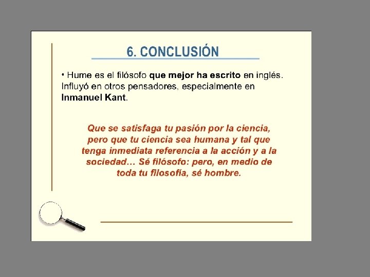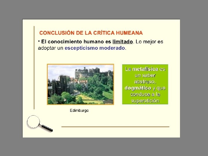 • Si alguien ha llegado hasta aquí otra conclusión, esta vez de vuestro profesor • El debate que se inició con los sofistas y Sócrates (continuado por Platón, Aristóteles y S. Tomás entre otros) lo volvemos a encontrar en la filosofía moderna • Descartes lucha contra el escepticismo y cree que podemos conocer la realidad y la verdad • Hume piensa por el contrario que nuestro conocimiento es limitado y su filosofía desemboca en el escepticismo • O sea, un callejón si salida • Veamos cómo lo soluciona el maestro: Immanuel Kant