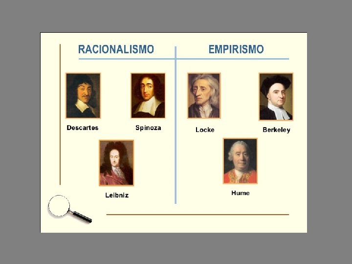 • El racionalismo es un movimiento filosófico que se desarrolla en el continente europeo y que cree en la autosuficiencia de la razón para alcanzar el conocimiento verdadero • Sus principales representantes son Descartes Leibniz y Spinoza • El empirismo es un movimiento filosófico que se desarrolla en las islas británicas y que considera que la experiencia (de empeiría) es la fuente de nuestro conocimiento • Sus principales representantes son Locke y Hume