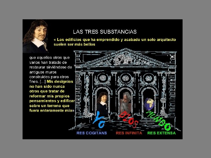 La concepción de la realidad de Descartes: las tres sustancias • • • Descartes entiende la realidad como sustancia Define la sustancia como una realidad que existe de tal manera que no necesita de ninguna otra realidad para existir Según Descartes existirían tres sustancias: La sustancia infinita o res infinita (Dios) cuyo atributo es la perfección La sustancia pensante o res cogitans (el yo) cuyo atributo es el pensamiento La sustancia extensa o res extensa (el mundo) cuyos atributos son la extensión y el movimiento