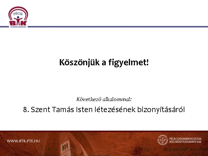 Köszönjük a figyelmet! Következő alkalommal: 8. Szent Tamás Isten létezésének bizonyításáról