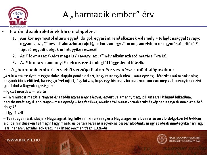 A „harmadik ember” érv • Platón ideaelméletének három alapelve: 1. Amikor egymástól eltérő egyedi dolgok egyaránt rendelkeznek valamely F tulajdonsággal (avagy: ugyanaz az „F” név alkalmazható rájuk), akkor van egy F forma, amelyben az egymástól eltérő Ftípusú egyedi dolgok mindegyike részesül. 2. Az F forma (az F-ség) maga is F (avagy: az „F” név alkalmazható magára F-re is). 3. Az F forma valamennyi F-nek nevezett dologtól függetlenül létezik. • A „harmadik ember” érv első verziója Platón Parmenidész című dialógusában: „Azt hiszem, te ilyen meggondolás alapján gondolod azt, hogy mindegyik idea – mint egység – létezik: amikor sok dolog nagynak tűnik előtted, ha végig nézel rajtuk, úgy látszik, hogy egy bizonyos forma azonosan van meg valamennyin: s ezért gondolod a Nagyot: egységnek. – Igazat mondasz – felelte. – Ha mármost magát a Nagyot és a többi egyes nagy tárgyat, együtt valamennyit egy pillantással átfogod lelkedben, nemde ismét egy újabb Nagy – mint egység – fog feltűnni, amely által mutatkoznak szükségképpen nagynak mind az előző dolgok? – Úgy látszik. – Tehát egy másik ideája a Nagyságnak fog feltűnni, amely magán a Nagyságon és a benne részesülő dolgokon túl bukkan elő; de mindezeken túl megint egy másik, és őáltala lesznek nagyok az összes előbbiek; és így az ideák mindegyike nem egy lesz, hanem végtelen sokaságú. ” (Platón: Parmenidész, 132 a–b)