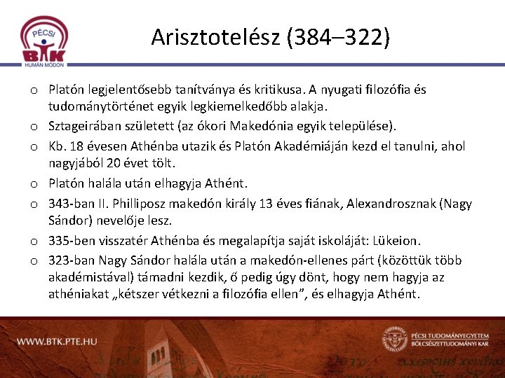 Arisztotelész (384– 322) o Platón legjelentősebb tanítványa és kritikusa. A nyugati filozófia és tudománytörténet egyik legkiemelkedőbb alakja. o Sztageirában született (az ókori Makedónia egyik települése). o Kb. 18 évesen Athénba utazik és Platón Akadémiáján kezd el tanulni, ahol nagyjából 20 évet tölt. o Platón halála után elhagyja Athént. o 343 -ban II. Philliposz makedón király 13 éves fiának, Alexandrosznak (Nagy Sándor) nevelője lesz. o 335 -ben visszatér Athénba és megalapítja saját iskoláját: Lükeion. o 323 -ban Nagy Sándor halála után a makedón-ellenes párt (közöttük több akadémistával) támadni kezdik, ő pedig úgy dönt, hogy nem hagyja az athéniakat „kétszer vétkezni a filozófia ellen”, és elhagyja Athént.