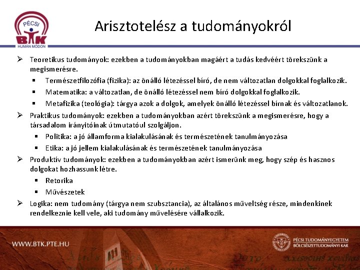 Arisztotelész a tudományokról Ø Teoretikus tudományok: ezekben a tudományokban magáért a tudás kedvéért törekszünk a megismerésre. § Természetfilozófia (fizika): az önálló létezéssel bíró, de nem változatlan dolgokkal foglalkozik. § Matematika: a változatlan, de önálló létezéssel nem bíró dolgokkal foglalkozik. § Metafizika (teológia): tárgya azok a dolgok, amelyek önálló létezéssel bírnak és változatlanok. Ø Praktikus tudományok: ezekben a tudományokban azért törekszünk a megismerésre, hogy a társadalom irányitóinak útmutatóul szolgáljon. § Politika: a jó államforma kialakulásának és természetének tanulmányozása § Etika: a jó jellem kialakulásának és természetének tanulmányozása Ø Produktív tudományok: ezekben a tudományokban azért ismerünk meg, hogy szép és hasznos dolgokat hozhassunk létre. § Retorika § Művészetek Ø Logika: nem tudomány (tárgya nem szubsztancia), az általános műveltség része, mindenkinek rendelkeznie kell vele, aki tudomány művelésére vállalkozik.