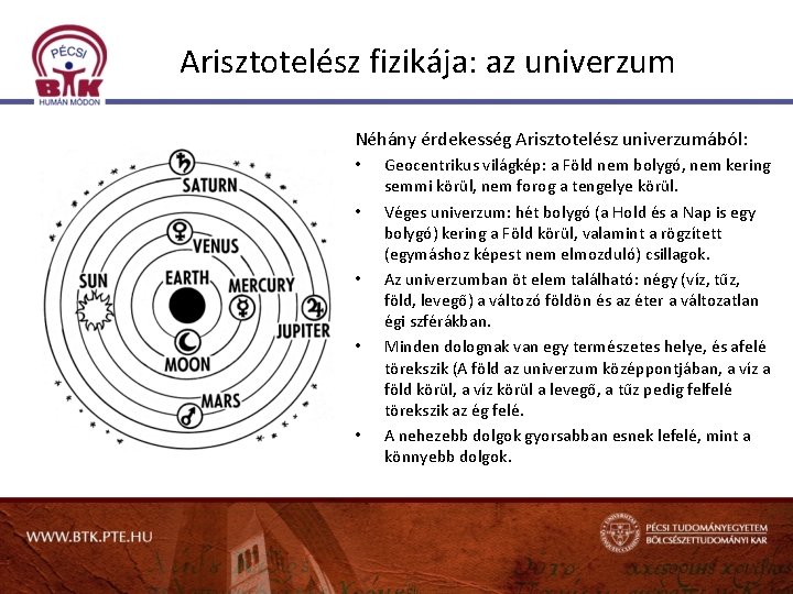 Arisztotelész fizikája: az univerzum Néhány érdekesség Arisztotelész univerzumából: • • • Geocentrikus világkép: a Föld nem bolygó, nem kering semmi körül, nem forog a tengelye körül. Véges univerzum: hét bolygó (a Hold és a Nap is egy bolygó) kering a Föld körül, valamint a rögzített (egymáshoz képest nem elmozduló) csillagok. Az univerzumban öt elem található: négy (víz, tűz, föld, levegő) a változó földön és az éter a változatlan égi szférákban. Minden dolognak van egy természetes helye, és afelé törekszik (A föld az univerzum középpontjában, a víz a föld körül, a víz körül a levegő, a tűz pedig felfelé törekszik az ég felé. A nehezebb dolgok gyorsabban esnek lefelé, mint a könnyebb dolgok.