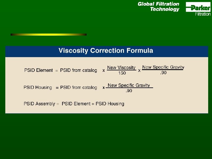 Filter Sizing t Pressure drop depends on: ØFilter Housing ØMedia Grade ØFluid Viscosity – Temperature – Oil Type ØFlow Rate