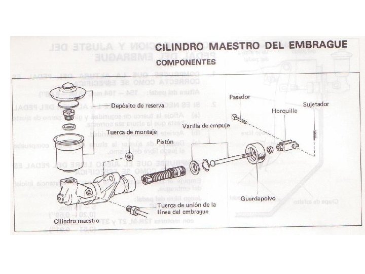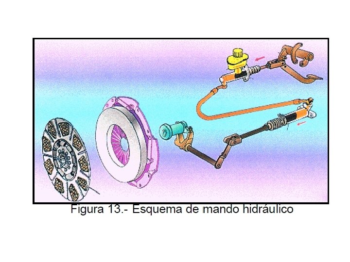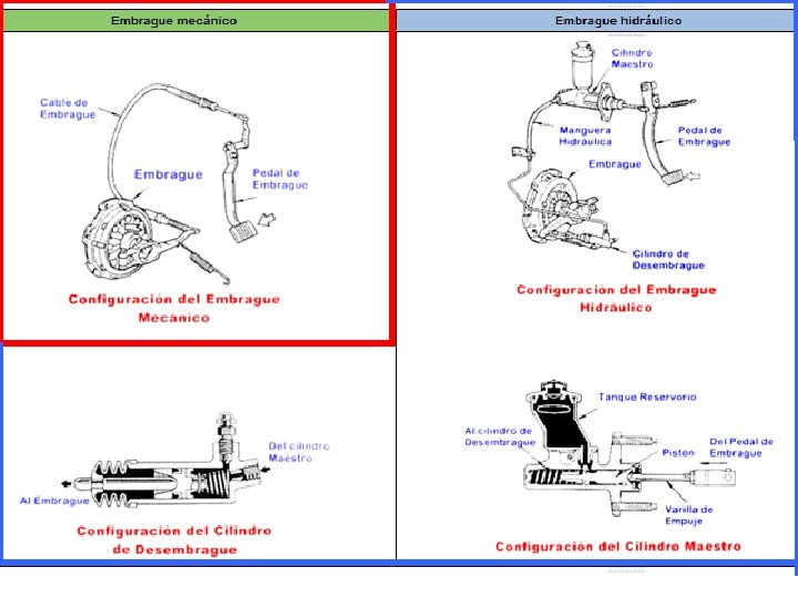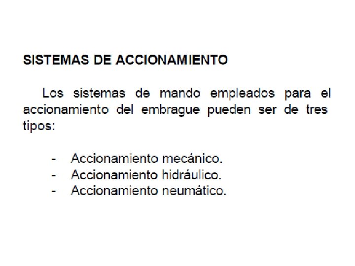 Sistemas de accionamiento del embrague de fricción (operación del embrague). Un embrague opera en una de las formas siguientes: • Embrague Mecánico. Los movimientos del pedal del embrague son transmitidos al embrague usando un cable. • Embrague Hidráulico. Los movimientos del pedal del embregue son transmitidos al embrague por presión hidráulica. Una varilla de empuje conectada al pedal de embrague genera presión hidráulica en el cilindro maestro cuando el pedal es presionado y esa presión hidráulica desconecta el embrague.