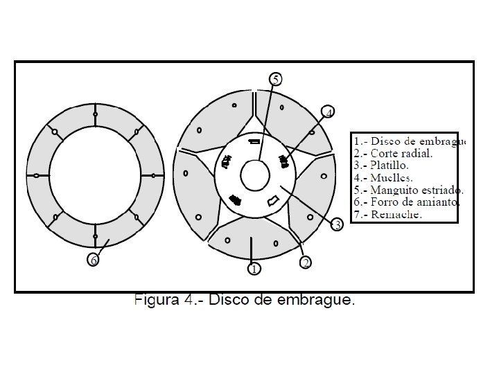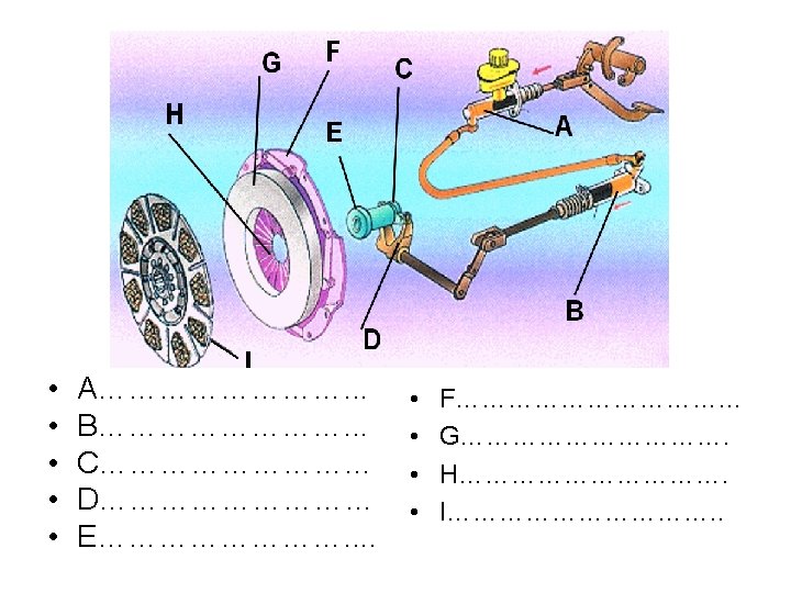 A: bomba de embrague. B: bombín de desembrague. C: porta collarín. D: horquilla. E: collarín. F: carcasa. G: plato de presión. H: diafragma. I : disco de embrague.