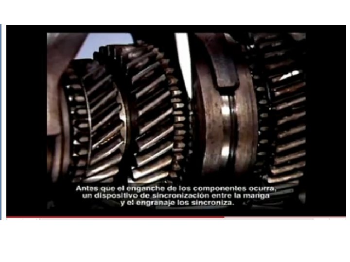 Para realizar una maniobra de cambio de velocidad, el conductor lleva la palanca a la posición deseada y, con esta acción, se produce el desplazamiento del manguito deslizante, que por medio del fiador de bola (6), desplaza consigo el cubo deslizante (7), cuya superficie cónica interna empieza a frotar contra el cono del piñón loco que, debido a ello, tiende a igualar su velocidad de giro con la del cubo sincronizador (que gira solidario con el eje secundario). Instantes después, al continuar desplazándose el manguito deslizante venciendo la acción del fiador, se produce el engrane de la misma con el dentado auxiliar del piñón loco sin ocasionar golpes ni ruidos en esta operación, dado que las velocidades de ambas piezas ya están sincronizadas. En estas condiciones, el piñón loco queda solidario del eje secundario, por lo que al producirse la acción de embragado, será arrastrado por el giro del motor con la relación seleccionada. Profesor: Carlos Alvarado de la Portilla