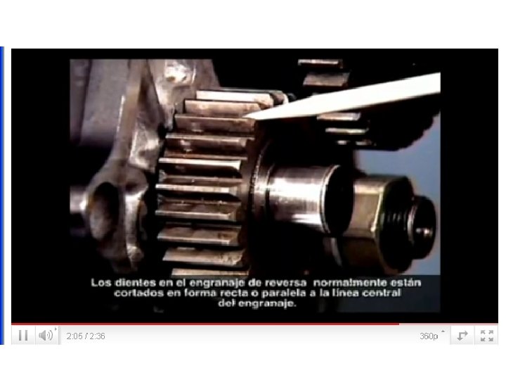 • Ejede demarchaatrás. Lleva un piñón que se interpone entre los árboles intermediario y secundario (longitudinal) o primario y secundario (transversal) para invertir el sentido de giro habitual del árbol secundario. En el engranaje de marcha atrás, normalmente se utiliza un dentado recto, en lugar de un dentado helicoidal, más sencillo de fabricar. Asimismo, cuando el piñón se interpone, cierra dos contactos eléctricos de un conmutador que permite lucir la luz o luces de marcha atrás, y al soltarlo, vuelve a abrir dichos contactos. Profesor: Carlos Alvarado de la Portilla