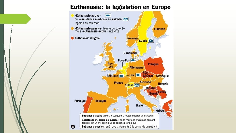 Lois Bénélux 2/2 Extension progressive du champ d’application (source document de formation du personnel médical Université Libre de Bruxelles) Grand âge et euthanasie Euthanasie acceptée en cas de polypathologies dont aucune n’est « grave » mais dont la somme rencontre le critère de gravité, en particulier compte tenu de l’âge du patient De même, des pathologies potentiellement curables peuvent devenir incurables s’agissant de personnes trop âgées et trop faibles pour supporter le traitement nécessaire Maladie d’Alzheimer , maladies psychiques : Euthanasie possible uniquement quand la maladie est suffisamment avancée pour entraîner des souffrances significatives mais pas trop avancée, pour que le patient soit encore en état d’exprimer une demande valable Mineurs : Belgique enfant de tous âges dotés de discernement depuis 2014 et Pays Bas Enfant de plus 12 ans doté de discernement depuis 2013) En 2014 la procédure de «demande actuelle » a été élargie aux mineurs d’âge non émancipés. Le patient mineur qui souhaite demander l’euthanasie doit être doté de la capacité de discernement, faire état de souffrances physiques insupportables (les souffrances psychiques ne sont pas prises en compte pour les mineurs) et doit, en outre, se trouver dans une situation médicale sans issue entraînant le décès à brève échéance. Les représentants légaux du patient mineur doivent marquer leur accord sur sa demande. Les mineurs n’ont pas accès à la déclaration anticipée. Enfants de moins de 1 an (protocole de Groningen 2004 sur les enfants dont la qualité de vie est jugée insuffisante)