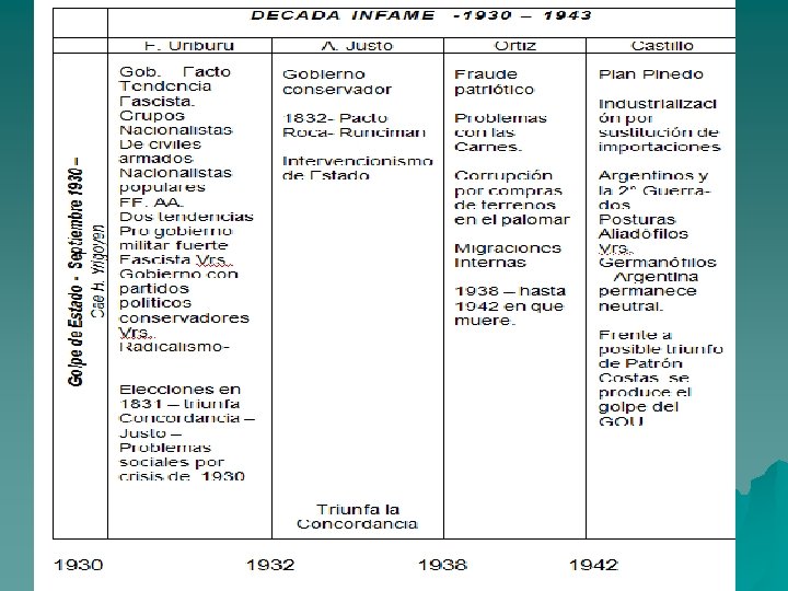 • La causa determinante de la caída de Yrigoyen radico en la coalición de fuerzas políticas , económicas y militares. • La conspiración militar se desarrollaba entre las filas del ejercito en donde había dos tendencias: Por un lado el de Uriburu ( tendencia nacionalista , proponía una reforma sustancial del régimen constitucional , eliminación del sufragio popular y su remplazo por una suerte de corporativismo. Por otro lado el del ex ministro de guerra Gral. Justo ( respaldada por sectores mayoritarios de la clase política conservadora ) Ambos coincidían en derrocar a Yrigoyen GOLPE DE ESTADO 1930
