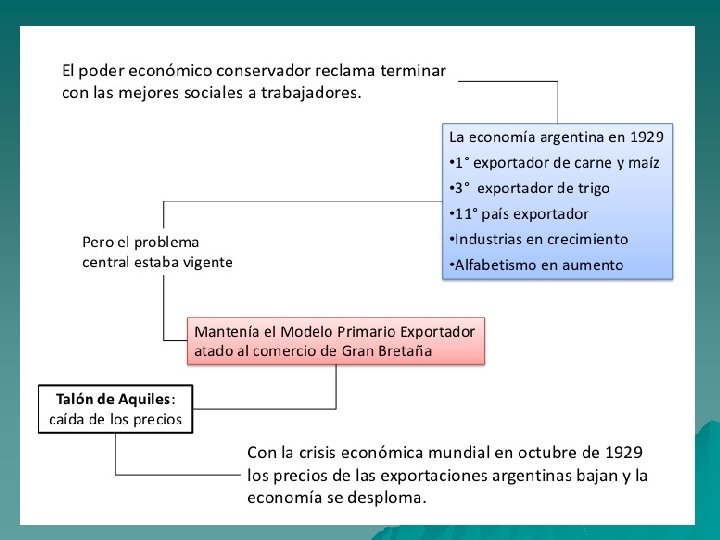 PRINCIPALES MEDIDAS ECONOMICAS u u u u El intervencionismo del Estado Creación de la Junta Nacional de Granos, reguladoras de la comercialización y producción agraria. Creación del Banco Central, con el fin de regular el mercado financiero mediante la administración monetaria. Ley de carnes, con el objeto de regular la producción. La fijación de impuestos a la renta y subsidios a la actividad agrícola. El establecimiento del control de cambios y de tarifas aduaneras selectivas La puesta en marcha de un plan de obras públicas Fomento con créditos la Industria alimenticia, textil, para sustituir importaciones de consumo interno.