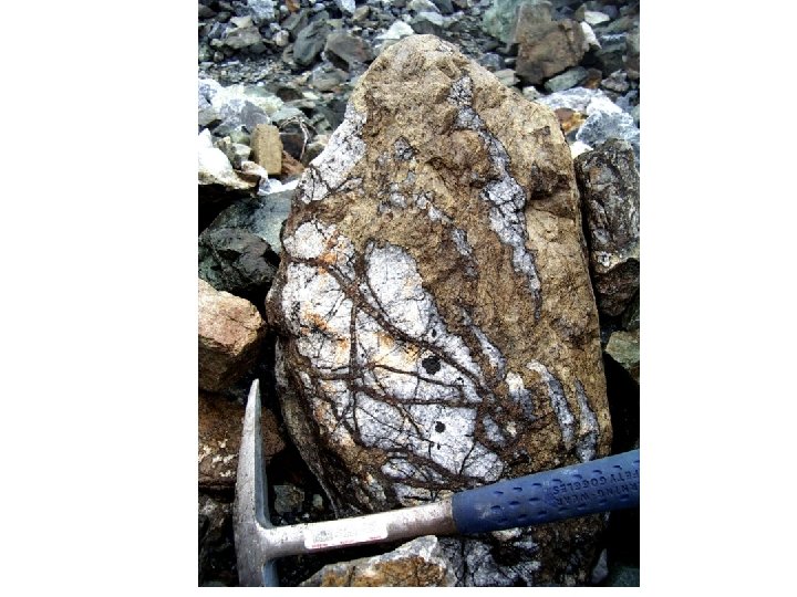 Mineralized veins • Very incompatible elements (large ions, typically) concentrated in last liquids, then in fluids • The same elements are leached from an already cooled rock (igneous intrusion or its wall-rock) • Precipitate with hydrothermal veins