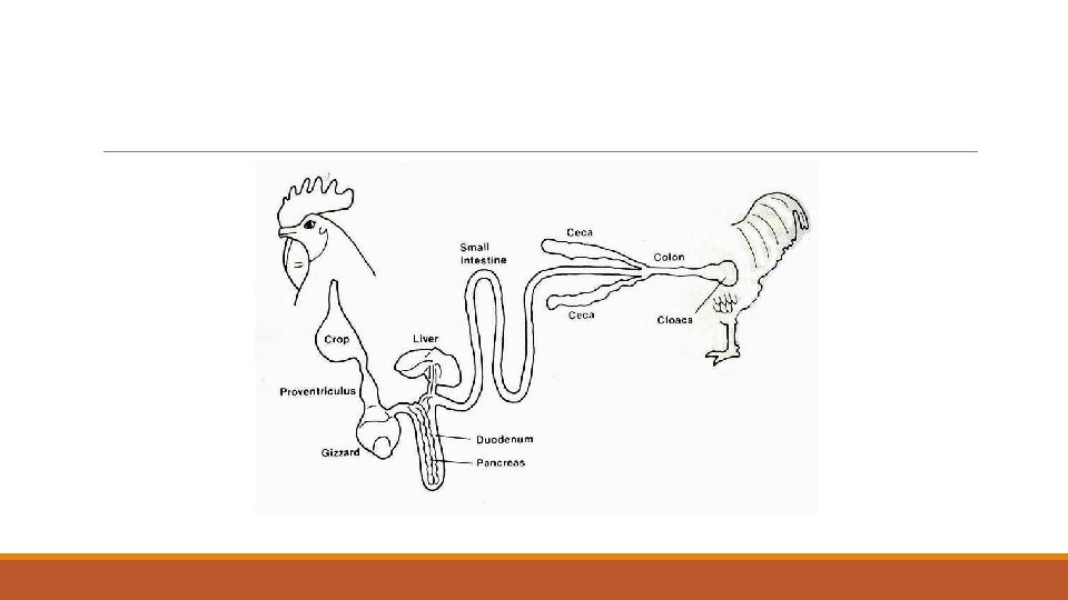 Digestive System- Birds Mouth – no teeth; therefore coarse feed must move to gizzard. �Fowl break their feed into a size that can be swallowed by pecking with their beaks or by scratching with their feet. � Crop – is an esophageal diverticulum and serves as a storage area for recently digested food. � Proventriculus – is similar to the stomach in carnivorous animals. � Gizzard – primary function is the reduction of the size of food particles by a grinding action. � Pepsin is present, an acid-base activity takes place, along with meager proteolysis.