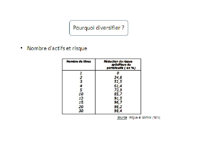 Composantes du risque d’un actif financier Variance du portefeuille Risque diversifiable Risque non diversifiable Nombre d’actifs et corrélation entre eux