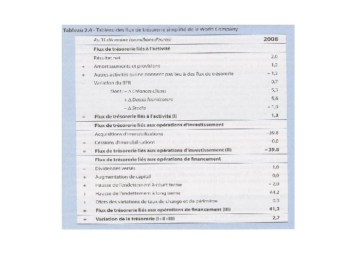 Flux de trésorerie • Définition • Différence avec les produits et charges comptables • Natures: – Flux de trésorerie liés à l’activité * – Flux de trésorerie liés aux opérations d'investissement – Flux de trésorerie liés aux opérations de financement