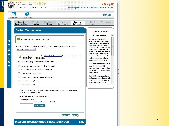 IRS DATA RETRIEVAL TOOL (DRT) Available 2 weeks after filing electronic tax return • The IRS DRT process is enhanced to more effectively encourage users to link to and transfer data from the IRS • More applications will have more accurate data, which will contribute to increased accuracy in awarding aid 20